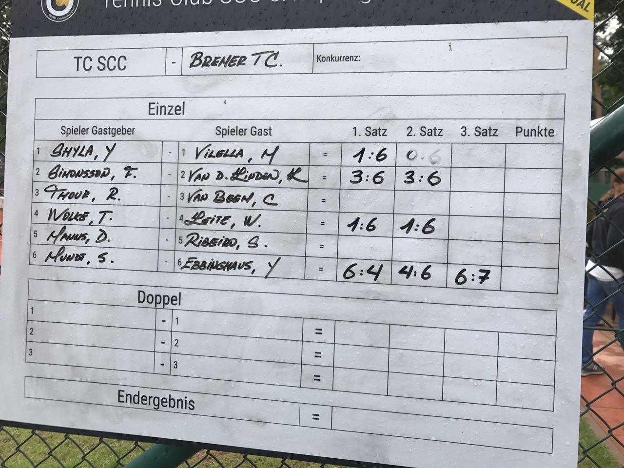Ziemlich schlecht sah es hingegen lange Zeit an Position sechs aus, wo sich Yannick Ebbinghaus nach schwachem Start aber immer mehr ins Match biss und noch mit 4:6, 6:4, 10:7 gewinnen konnte. Lediglich Samuel Ribeiro Navarrete musste sich geschlagen geben. Wobei der Altmeister beim Zwischenstand von 4:6, 7:5 und 9:8 im Match-Tiebreak des dritten Durchgangs nur einen einzigen Punkt vom Sieg entfernt war, sein Gegner den Matchball allerdings nervenstark mit einem Ass abwehrte.