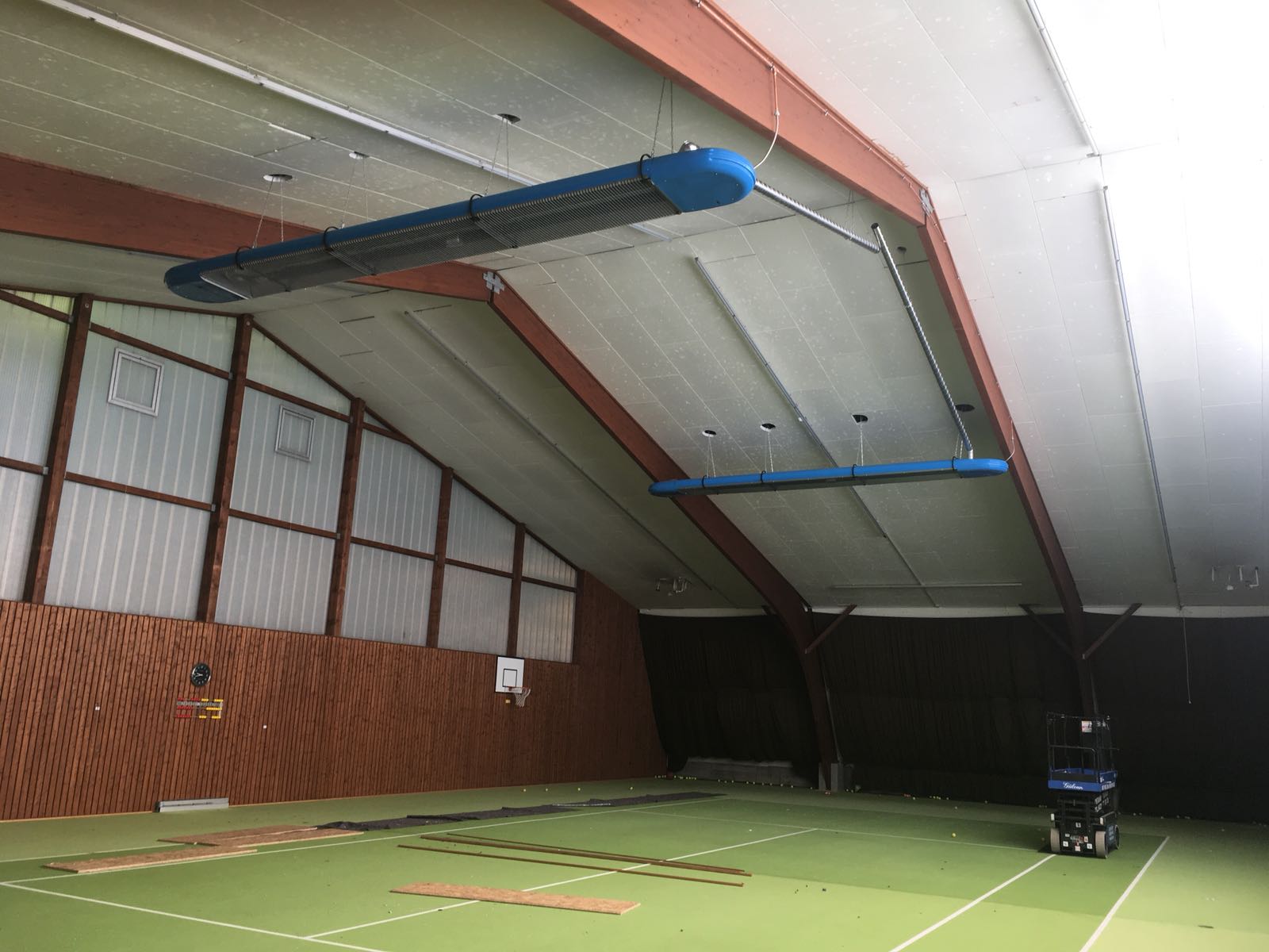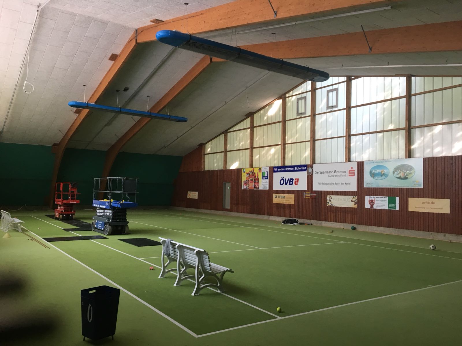 Die Modernisierung bestand hauptsächlich aus zwei Bereichen. Die alte Heizung wurde durch eine moderne Infrarot-Strahlungsheizung mit Flüssiggas-Befeuerung ersetzt, die sehr effektiv ist und inzwischen in vielen Sporthallen eingesetzt wird. Kalte Hallen an kalten Tagen sollten nun also der Vergangenheit angehören. Gefördert wird diese Maßnahme aus dem Klimafond von RKW Bremen GmbH. Außerdem wurde die Heizung für die Nebenräume inkl. Warmwasserspeicher mit größerer Kapazität erneuert, so dass Kaltduschen auch bei hoher Frequenz kein Thema mehr sein sollte. Der altersschwache Öl-Erdtank wurde stillgelegt und durch einen Flüssiggastank ersetzt. Dadurch wird der Komfort erhöht und der Energieverbrauch gesenkt.