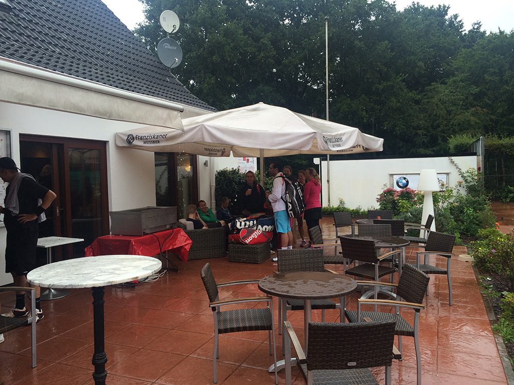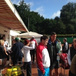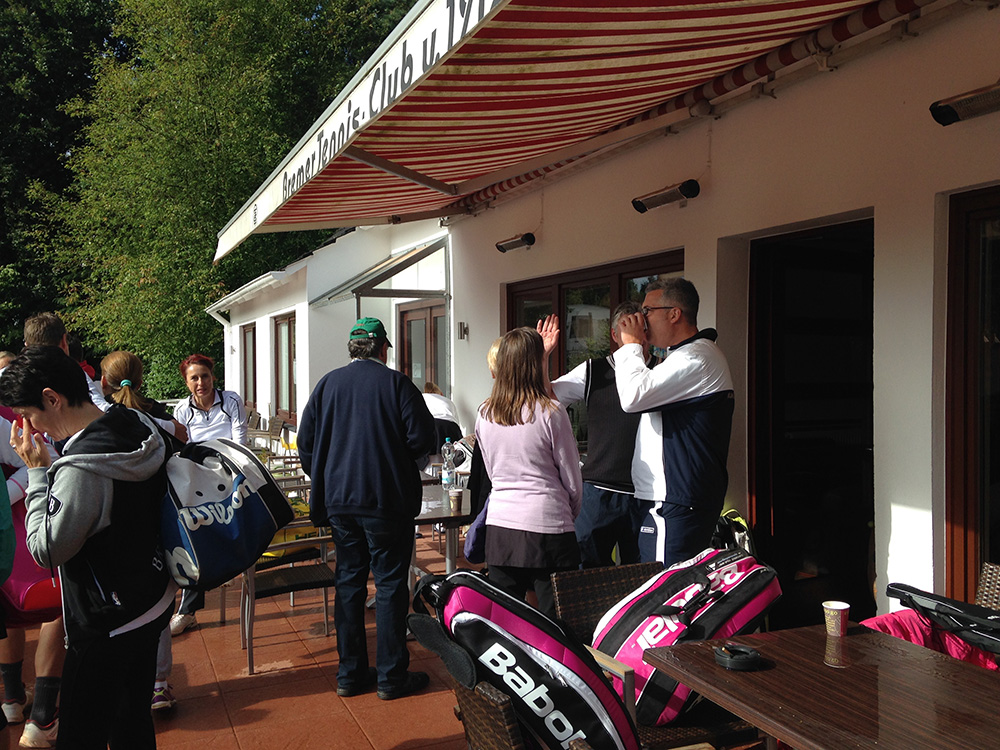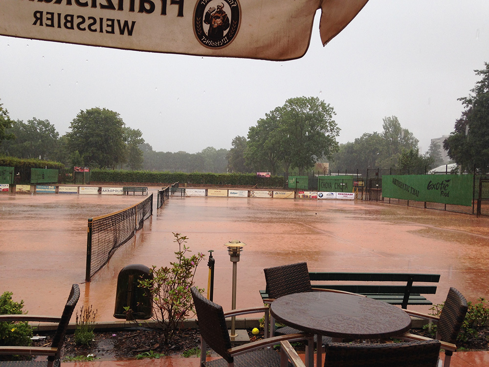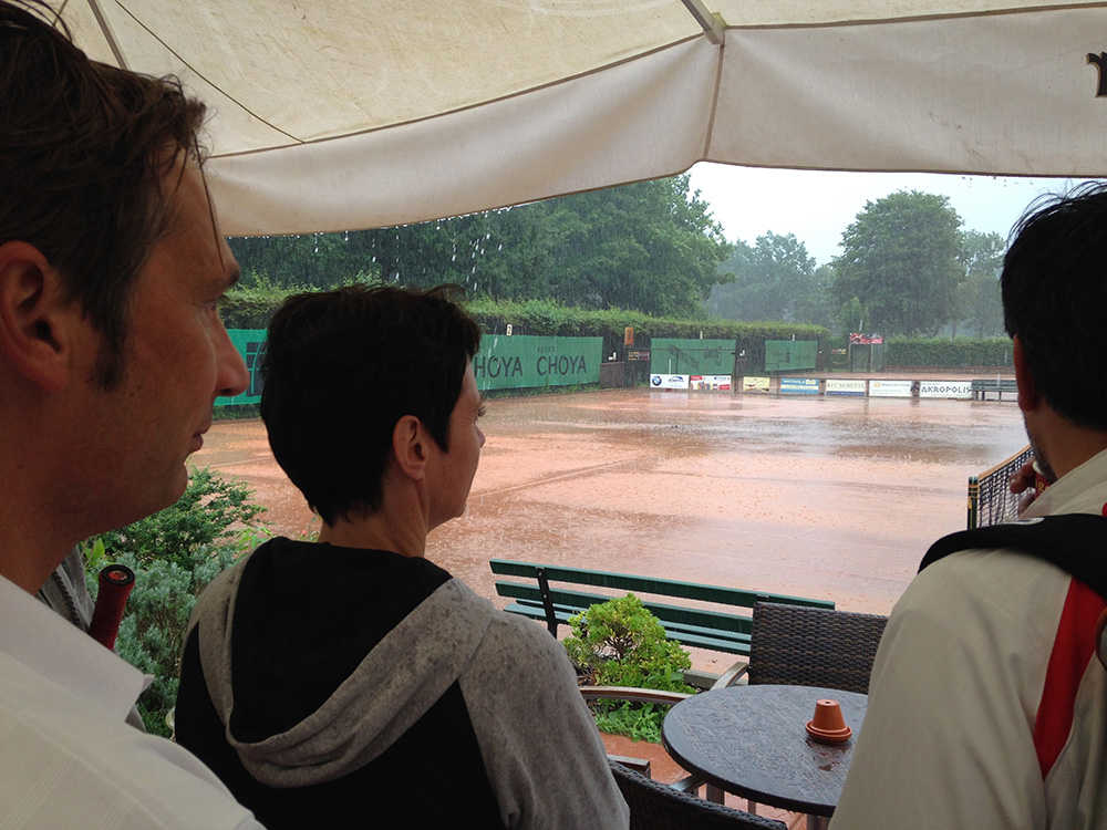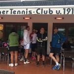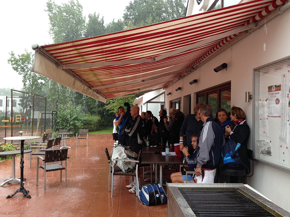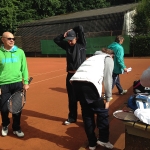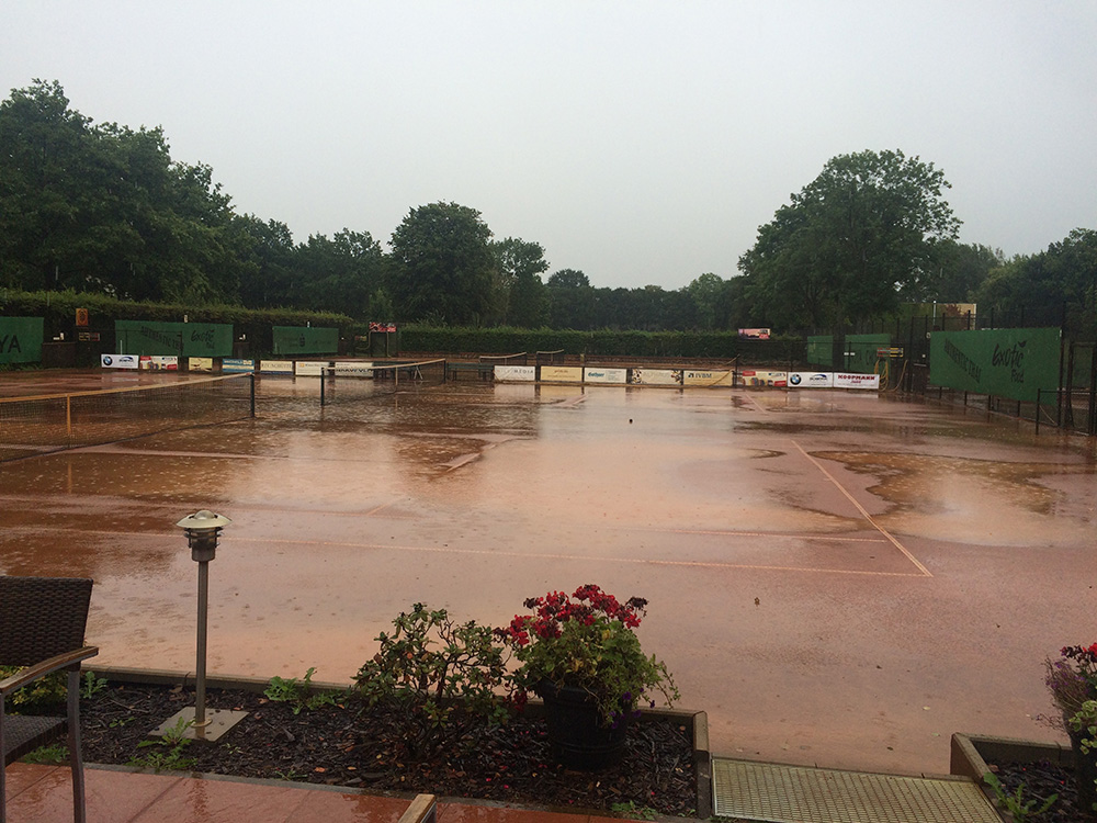 Bei gutem Wetter wurden auf acht Plätzen die ersten Matches gestartet. Leider machte uns nach kurzer Zeit das Wetter einen sehr dicken Strich durch die Rechnung: Die Plätze standen tief unter Wasser, so dass an ein Spielen auf den Außenplätzen nicht mehr zu denken war. Also ab in die Halle, was in Anbetracht der vielen Teilnehmer natürlich nicht einfach war.