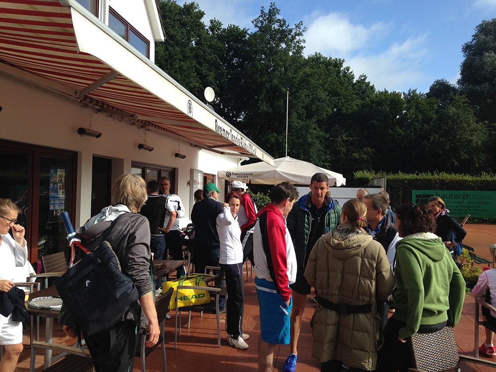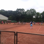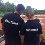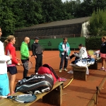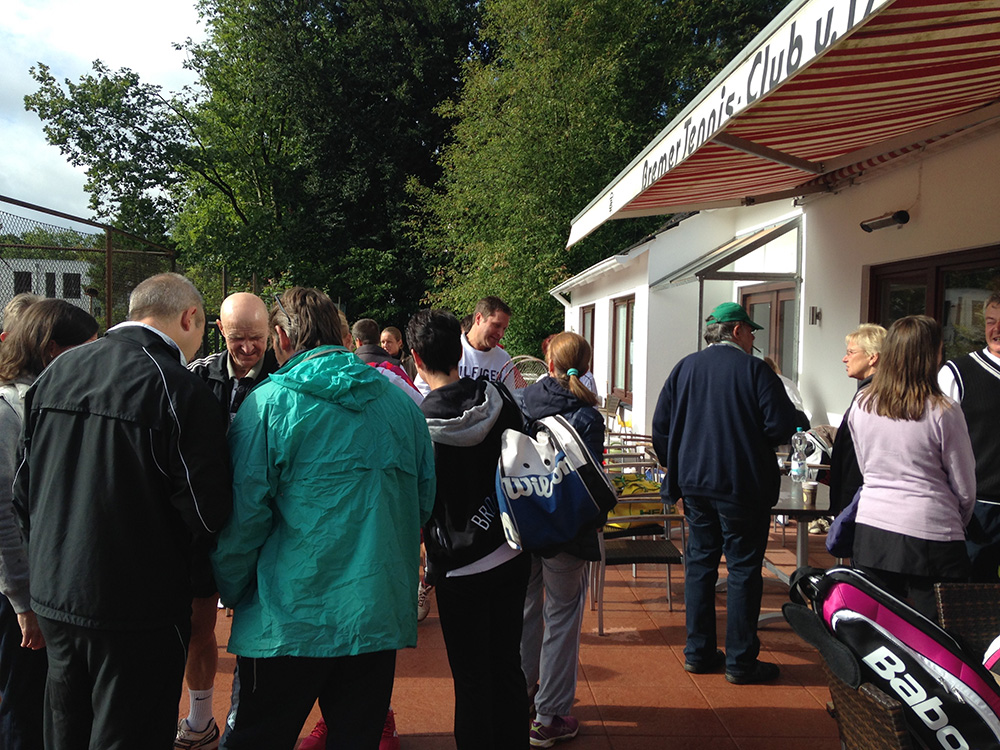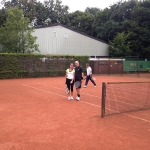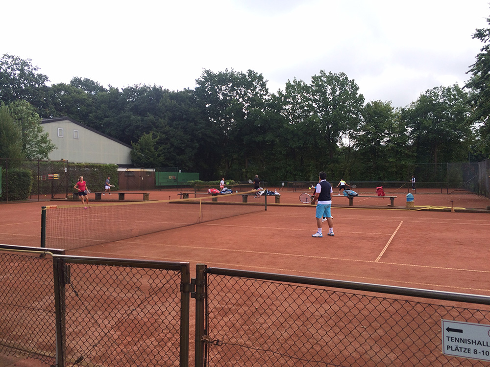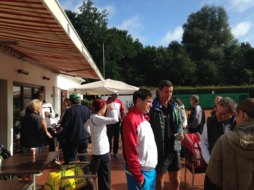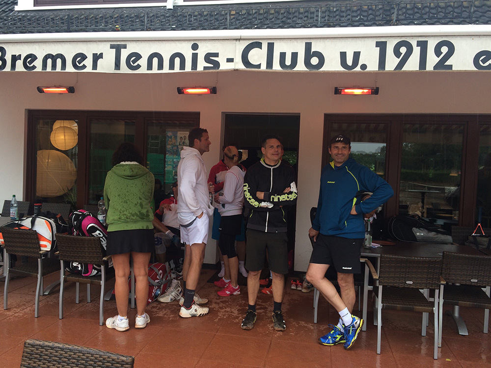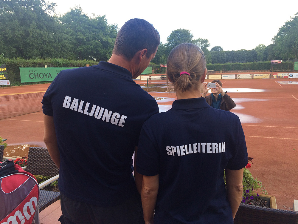 Bei gutem Wetter wurden auf acht Plätzen die ersten Matches gestartet. Leider machte uns nach kurzer Zeit das Wetter einen sehr dicken Strich durch die Rechnung: Die Plätze standen tief unter Wasser, so dass an ein Spielen auf den Außenplätzen nicht mehr zu denken war. Also ab in die Halle, was in Anbetracht der vielen Teilnehmer natürlich nicht einfach war.