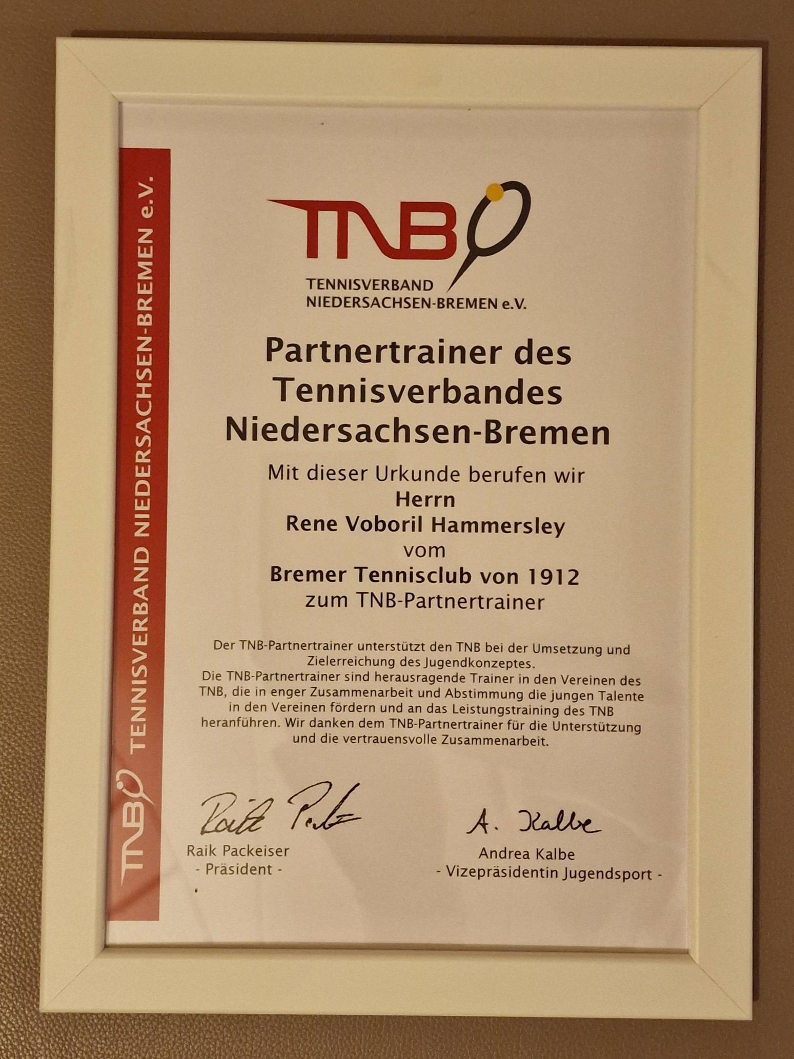 Unser Trainer René Voboril Hammersley ist Mitte Februar zum Partnertrainer des Tennisverbandes Niedersachsen-Bremen ernannt worden.